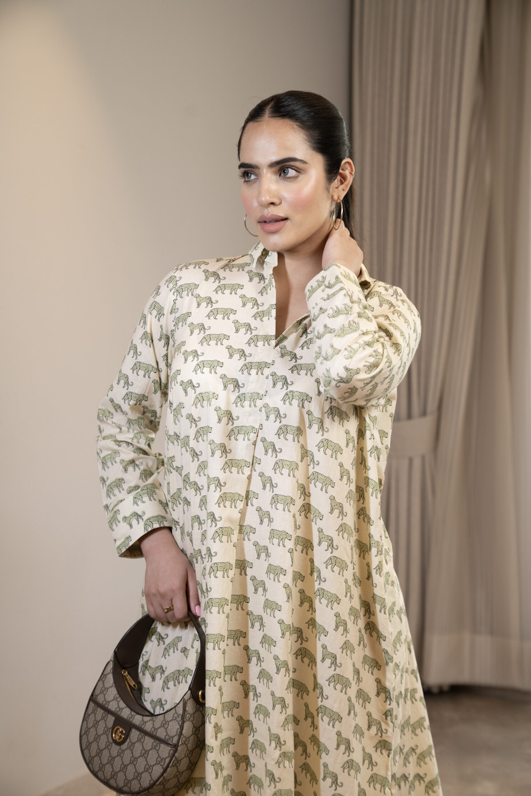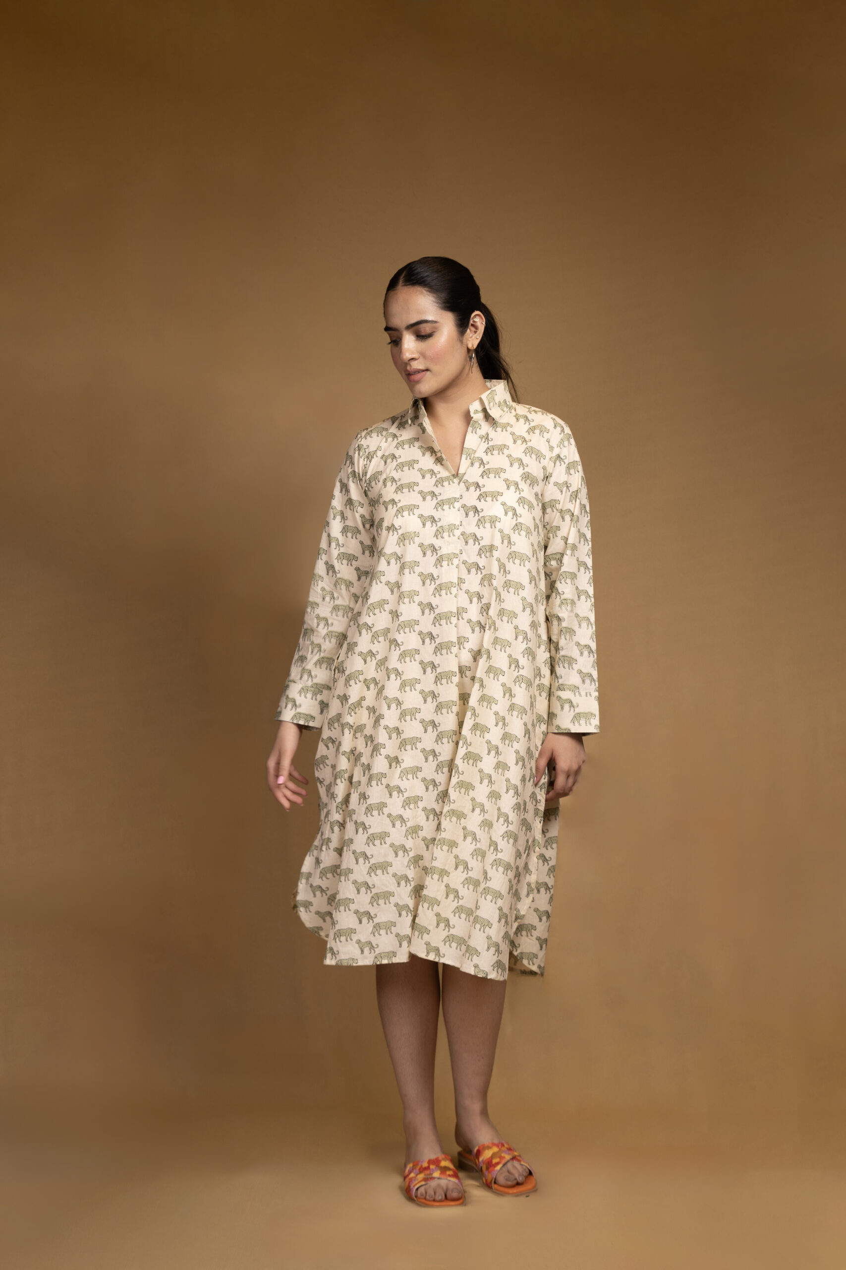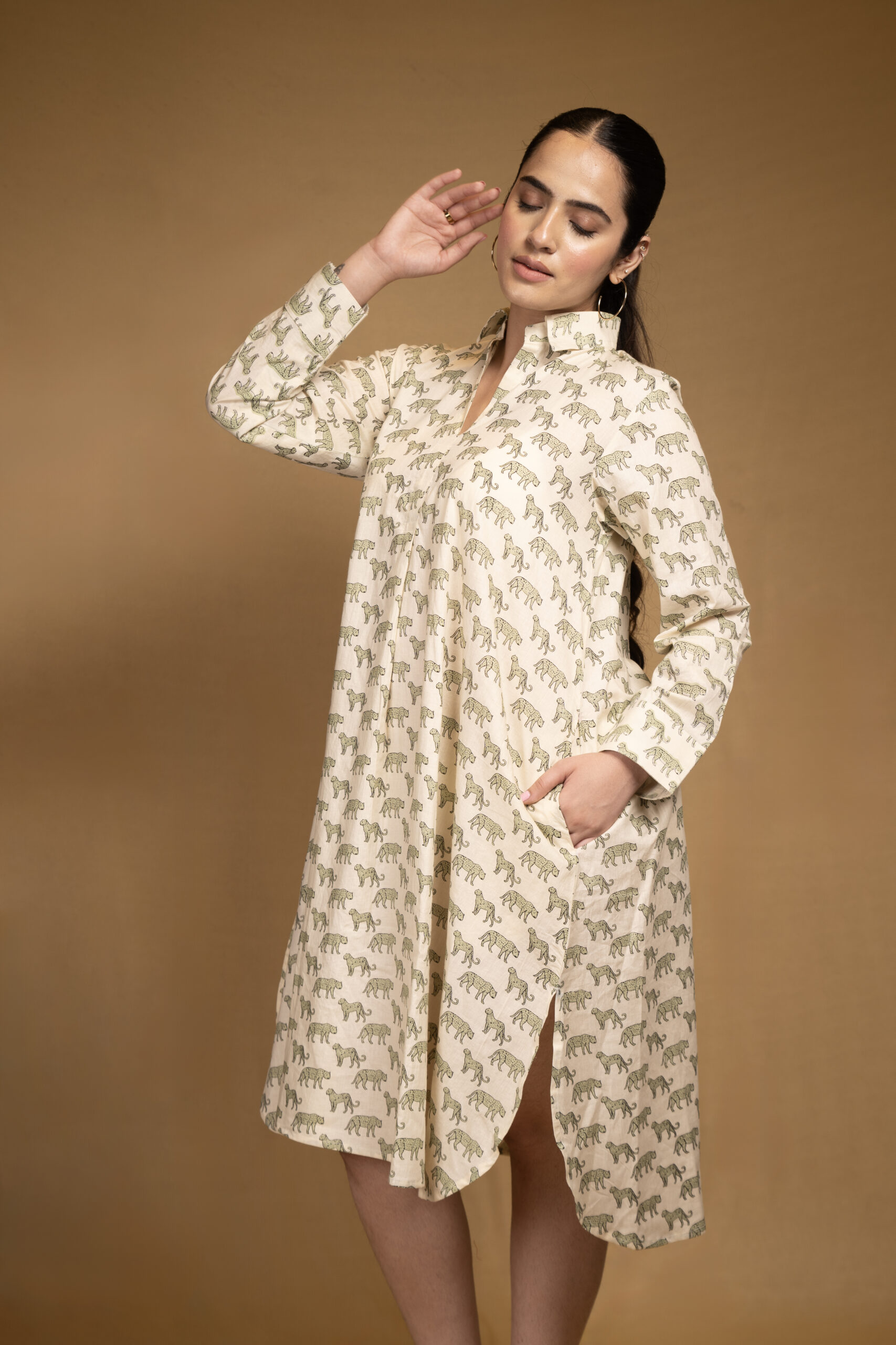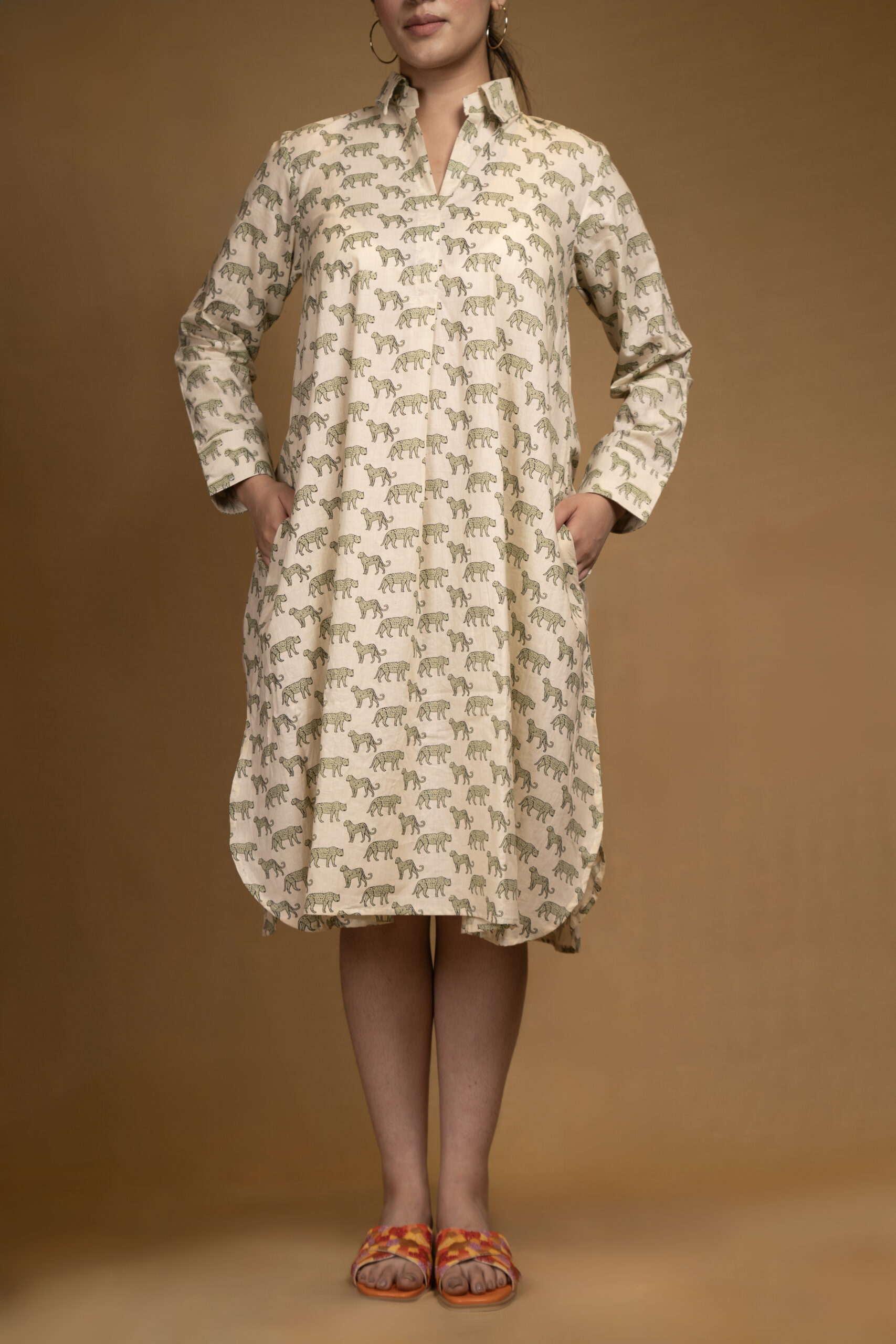 Cream cotton dress with a cute animal print, featuring a collared neckline and side slits for ease.