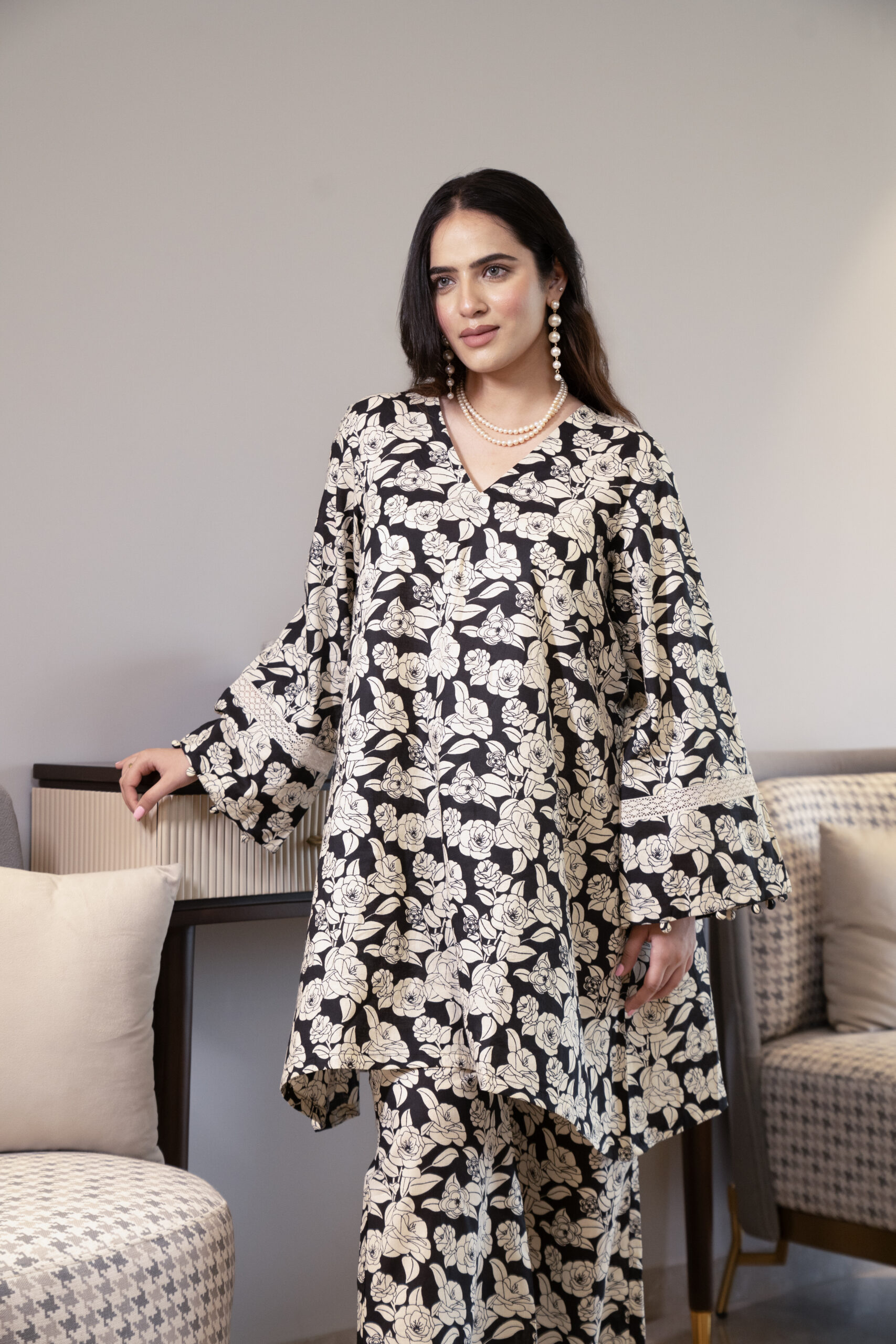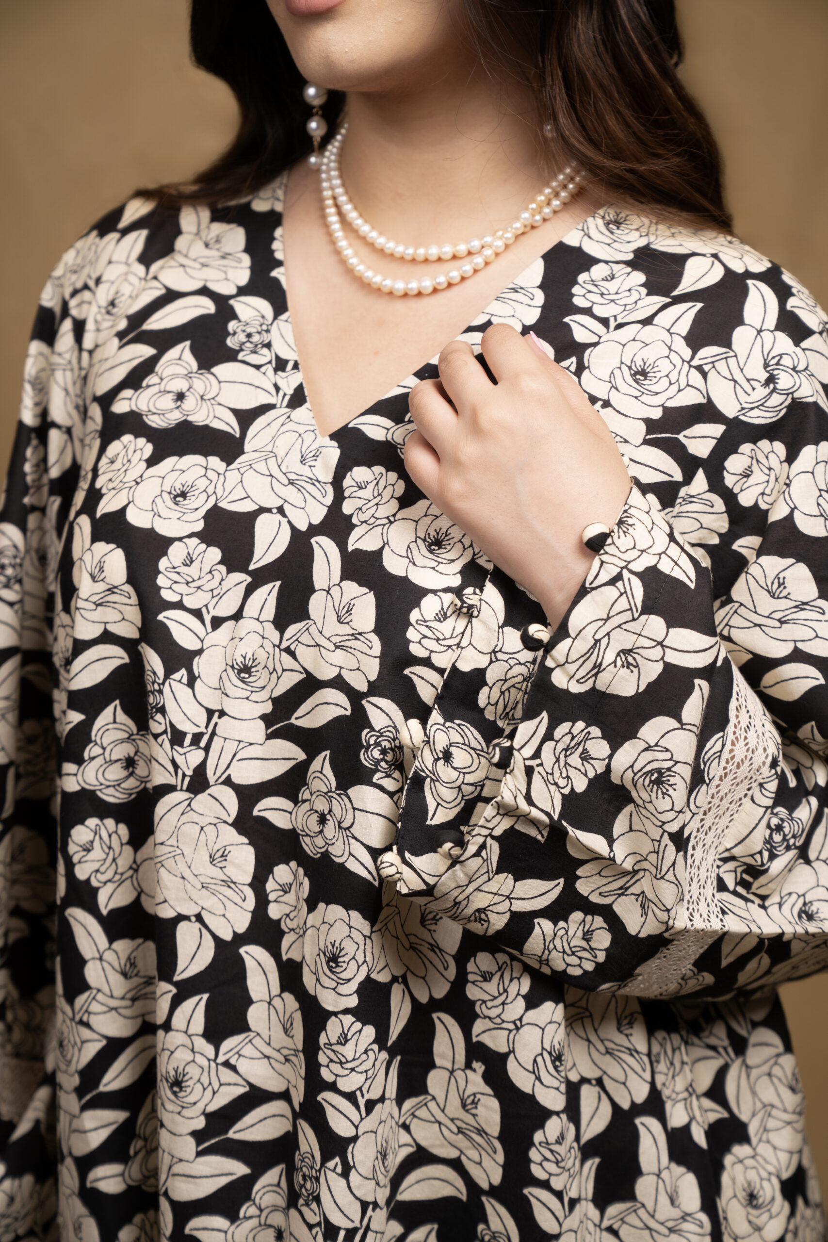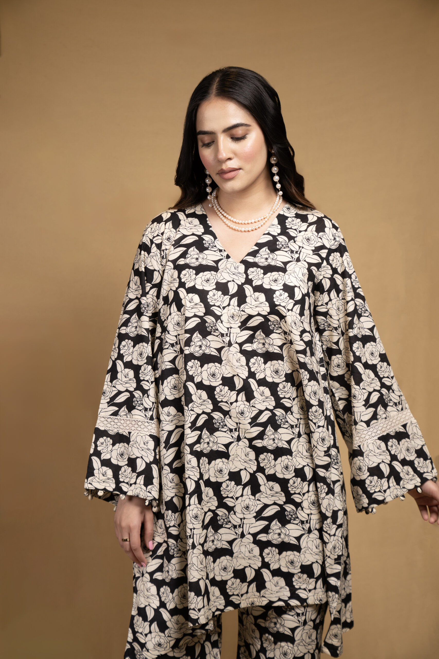 A black and off-white floral printed co-ord set featuring a kurta with delicate lace detailing.