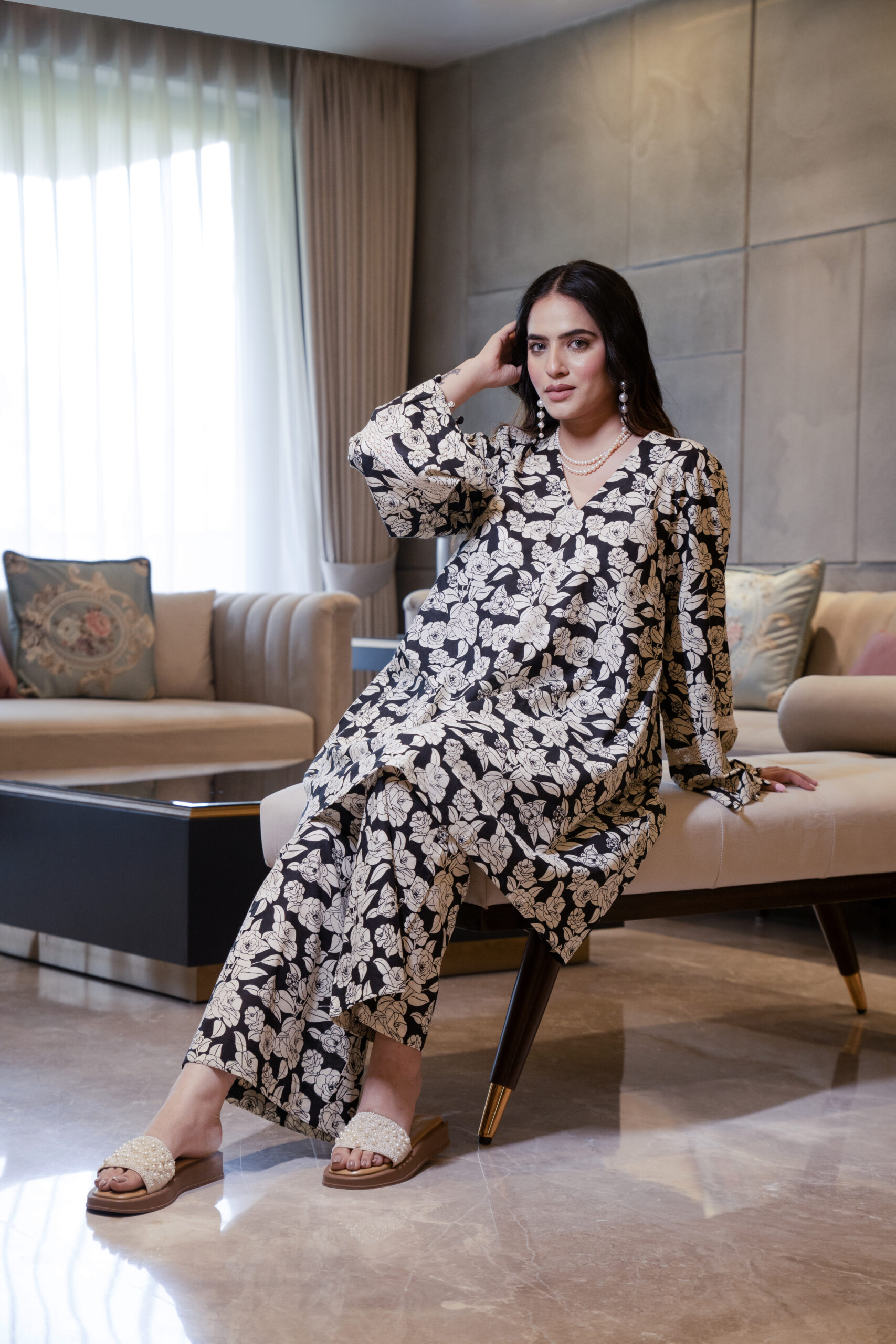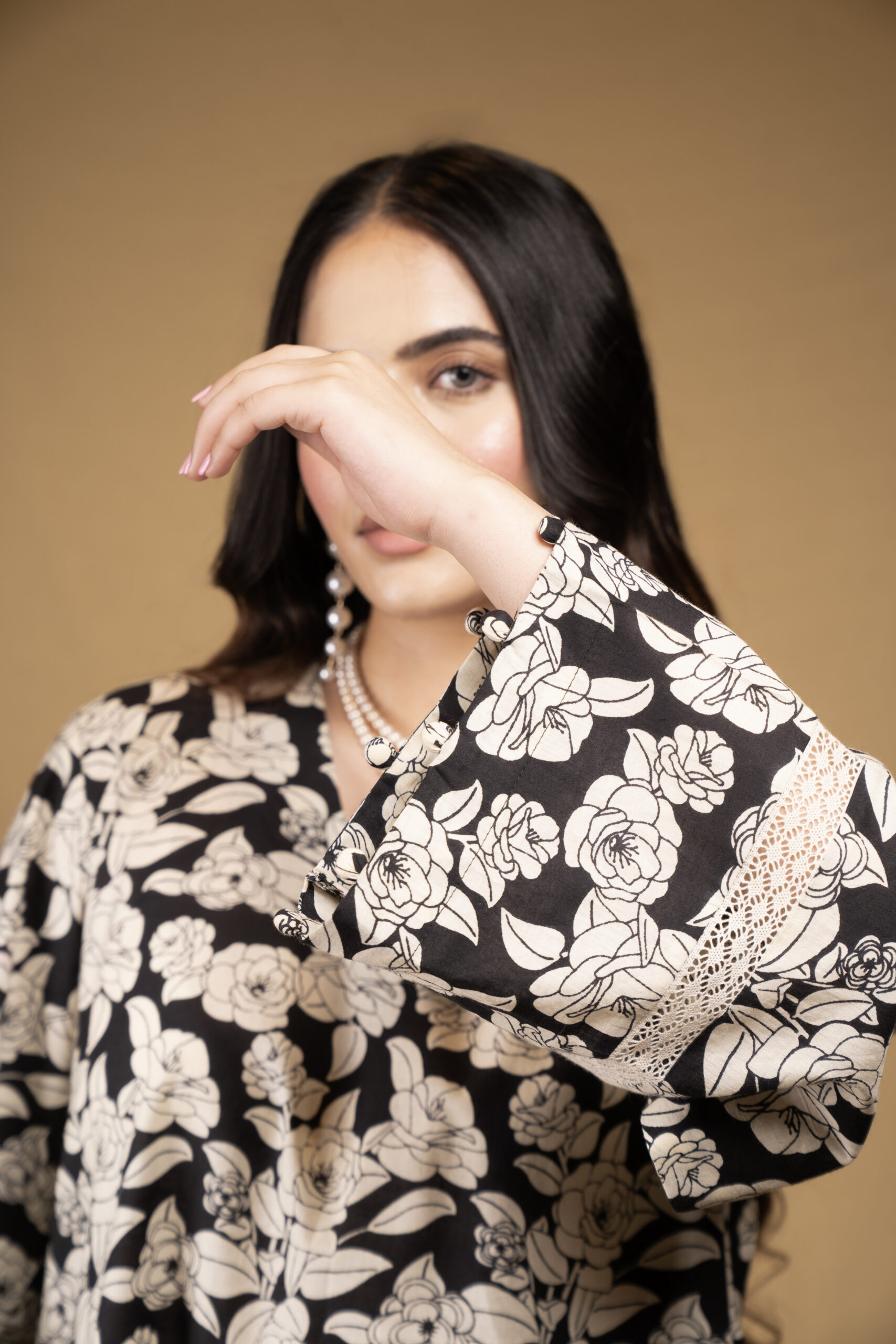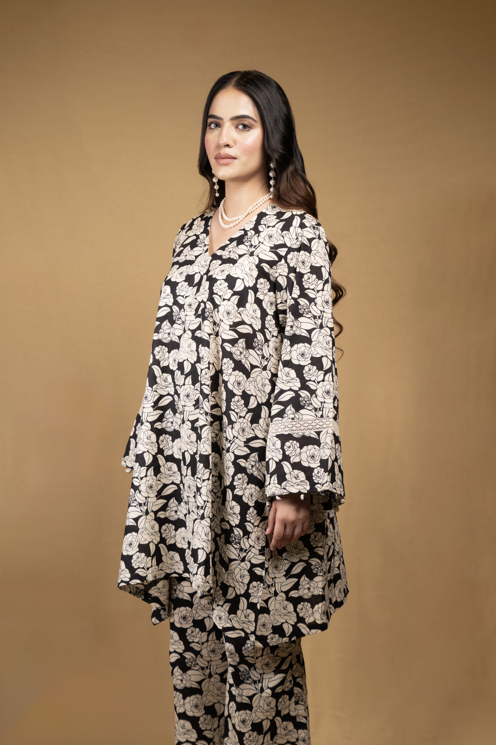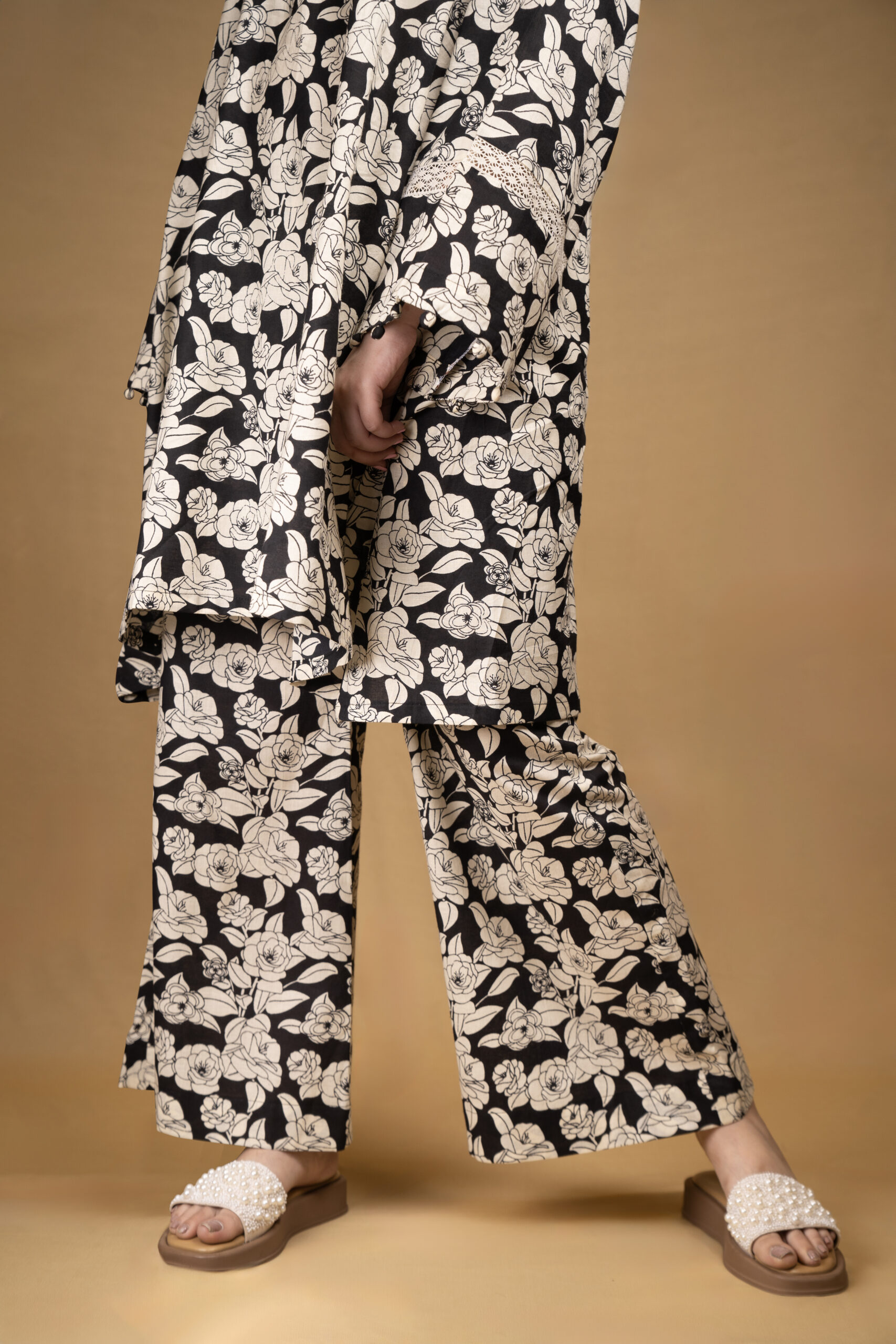 A black and off-white floral printed co-ord set featuring a kurta with delicate lace detailing.